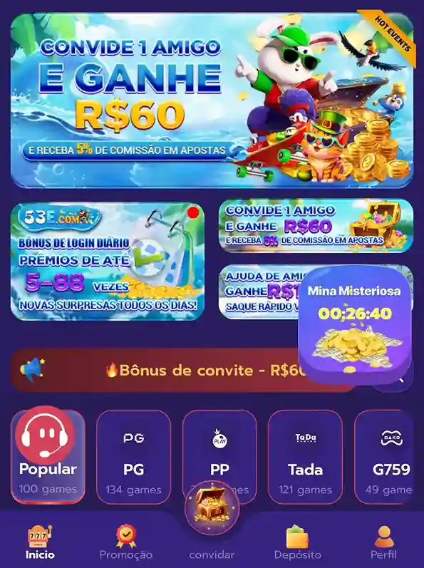 A plataforma oferece duas promoções vantajosas: você pode ganhar 5% de comissão por cada jogador indicado, criando uma forte renda passiva mensal, e também convidar um amigo para receber R$60 imediatamente, continuando a ganhar 5% das atividades dele — tornando ambas as ofertas formas simples e lucrativas de aumentar seus ganhos.